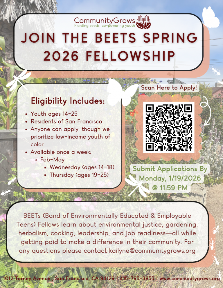 Serving youth of color and low income youth ages 14-25, the BEETs Program meets in the Western Addition and holds sessions both indoors in our classroom, and outdoors in our learning gardens. Youth are compensated with a pay increase available if they choose to return as a Leadership Crew member the following year.